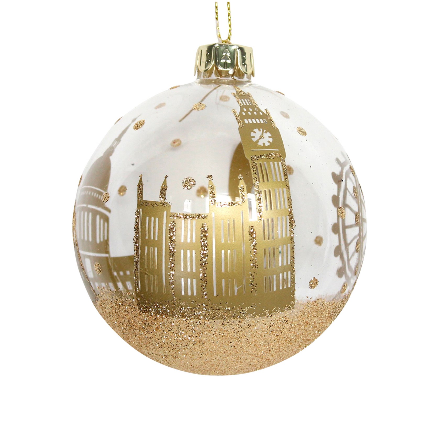 Χρυσό στολίδι με τα αγαπημένα σημεία του Λονδίνου. Γυάλινο, με γκλιτερ λεπτομέρειες, ιδανικό γα να δώσει στον χώρο σας την κομψότητα που του ταιριάζει.