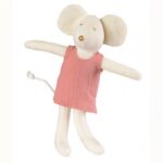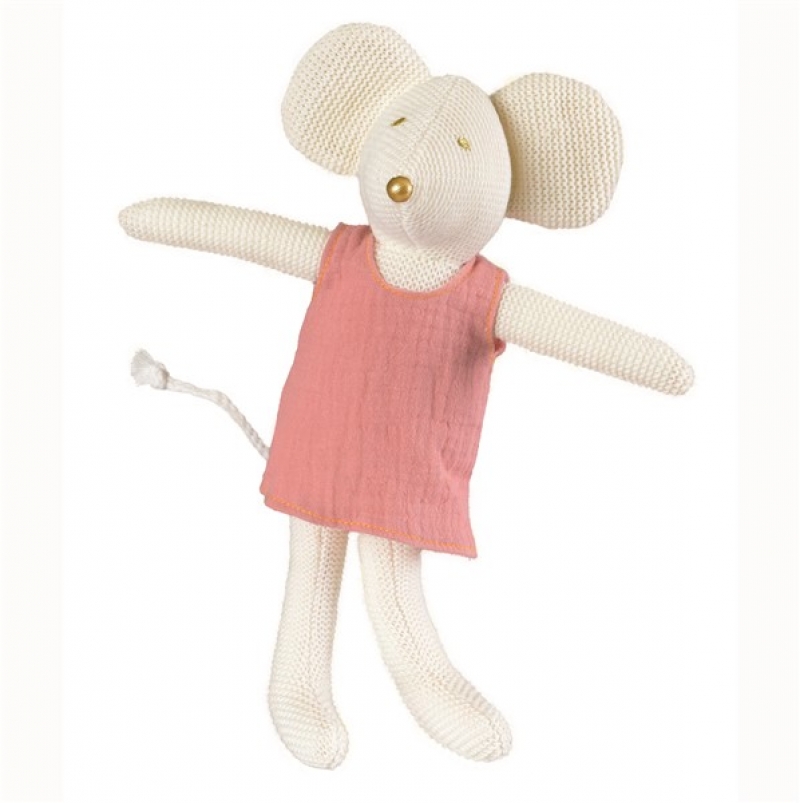 Η Céleste, το πλεκτό ποντίκι! Με τα μακριά χέρια και την ουρά της, είναι εύκολο να την κρατήσεις. Τράβηξε την ουρά της! Μια γλυκιά μελωδία ηχεί! Τόσο πολύ διασκεδαστικό! Το απαλό ροζ φόρεμα είναι από βαμβάκι διπλής γάζας, ενώ πλένεται στο πλυντήριο στους 30C.