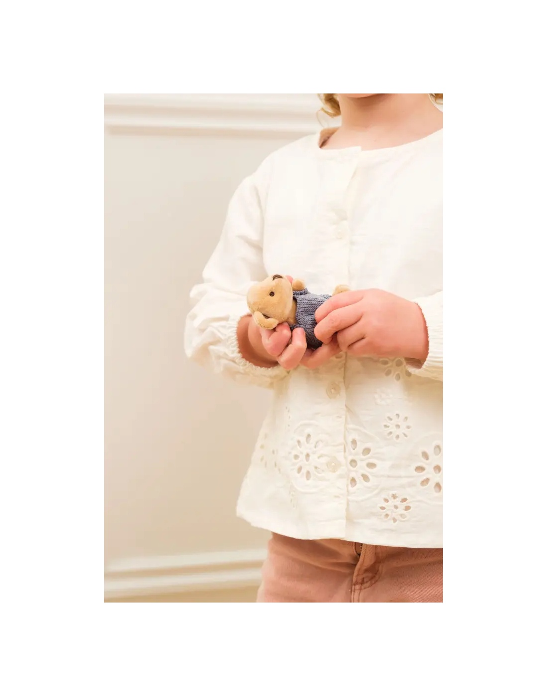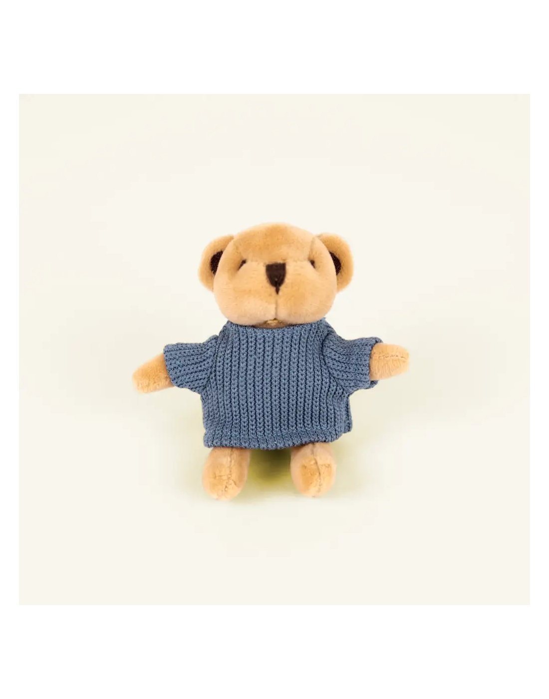 Ένα γλυκύτατο μίνι αρκουδάκι ντυμένο με πλεκτό μπλε πουλόβερ, ιδανικό για παιχνίδι ρόλων και για να συνοδεύει τα μικρά σε κάθε τους περιπέτεια. Το απαλό του ύφασμα και οι ήπιες αποχρώσεις το κάνουν ένα τρυφερό δωράκι για κάθε ηλικία.