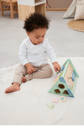 Ξύλινο τρίγωνο δραστηριοτήτων με διαφορετικά παιχνίδια που ενθαρρύνουν την εξερεύνηση και τη μάθηση.