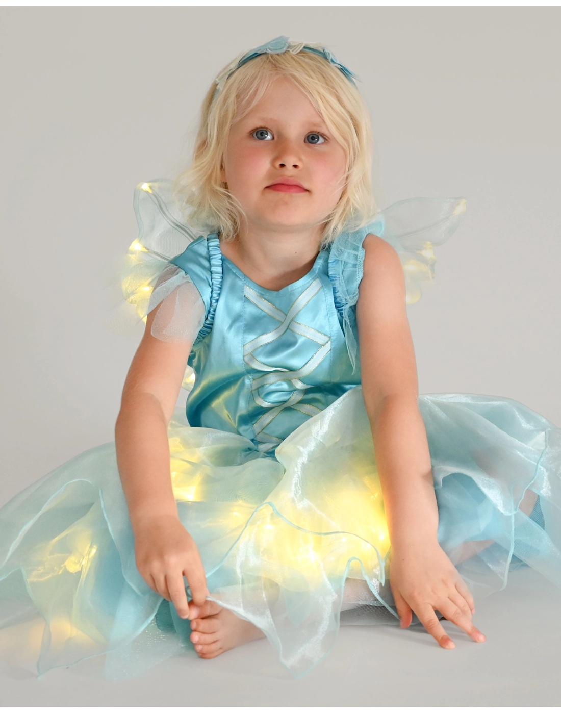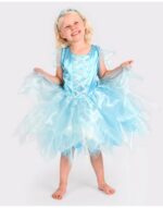 Παιδική στολή νεράιδας σε γαλάζιο χρώμα με φόρεμα από τούλι και ενσωματωμένα φωτάκια, που δημιουργούν ένα εντυπωσιακό φωτεινό αποτέλεσμα. Το φόρεμα διαθέτει άνετη εφαρμογή και αέρινη φούστα, ενώ τα διάφανα φτερά ολοκληρώνουν το νεραϊδένιο σύνολο.