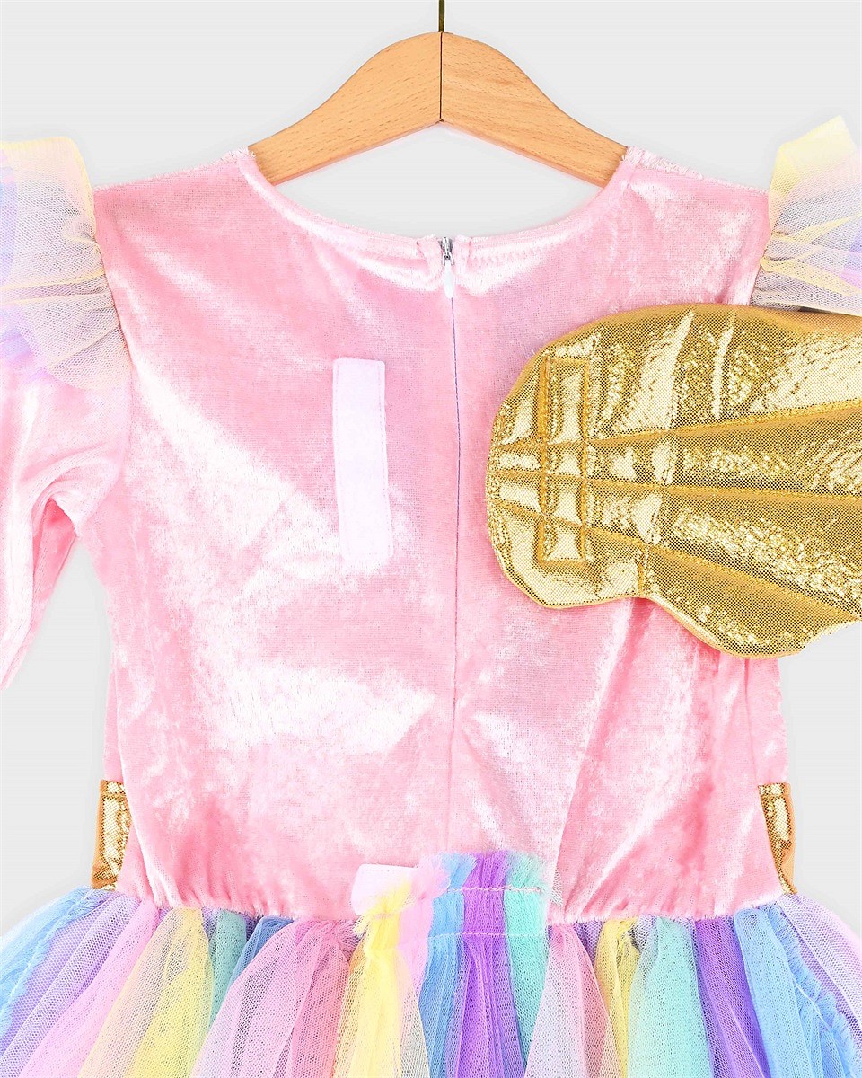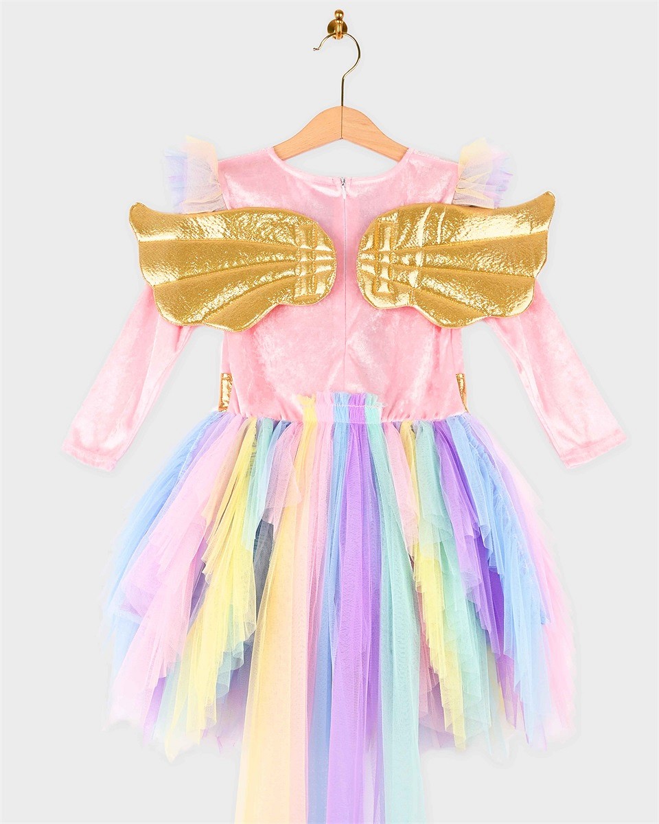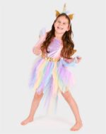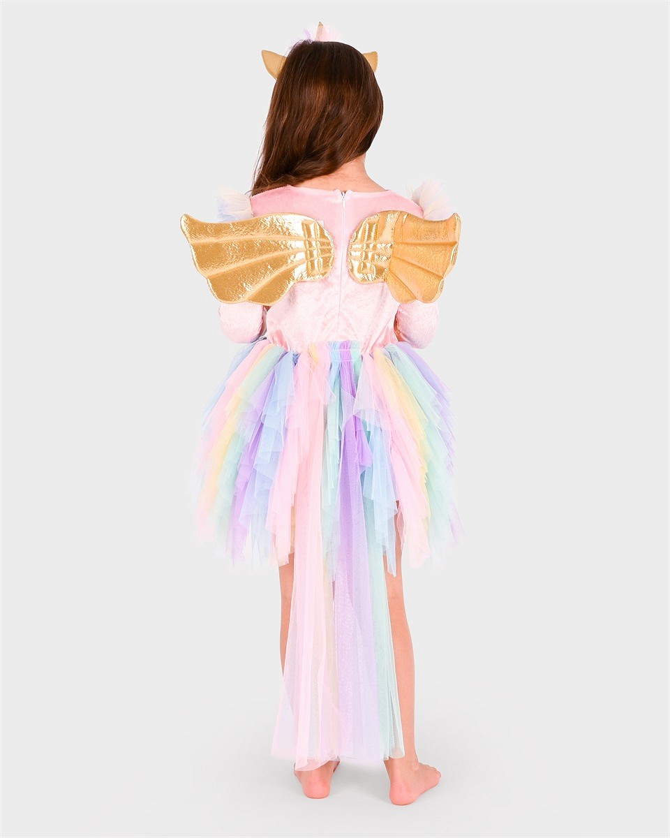 Η στολή διαθέτει πολύχρωμη φούστα από τούλι σε αποχρώσεις του ουράνιου τόξου, εντυπωσιακό χρυσό κέρας και λαμπερά φτερά, δημιουργώντας ένα ολοκληρωμένο και ονειρικό αποτέλεσμα.