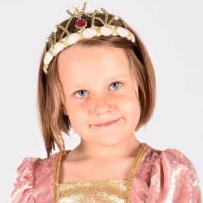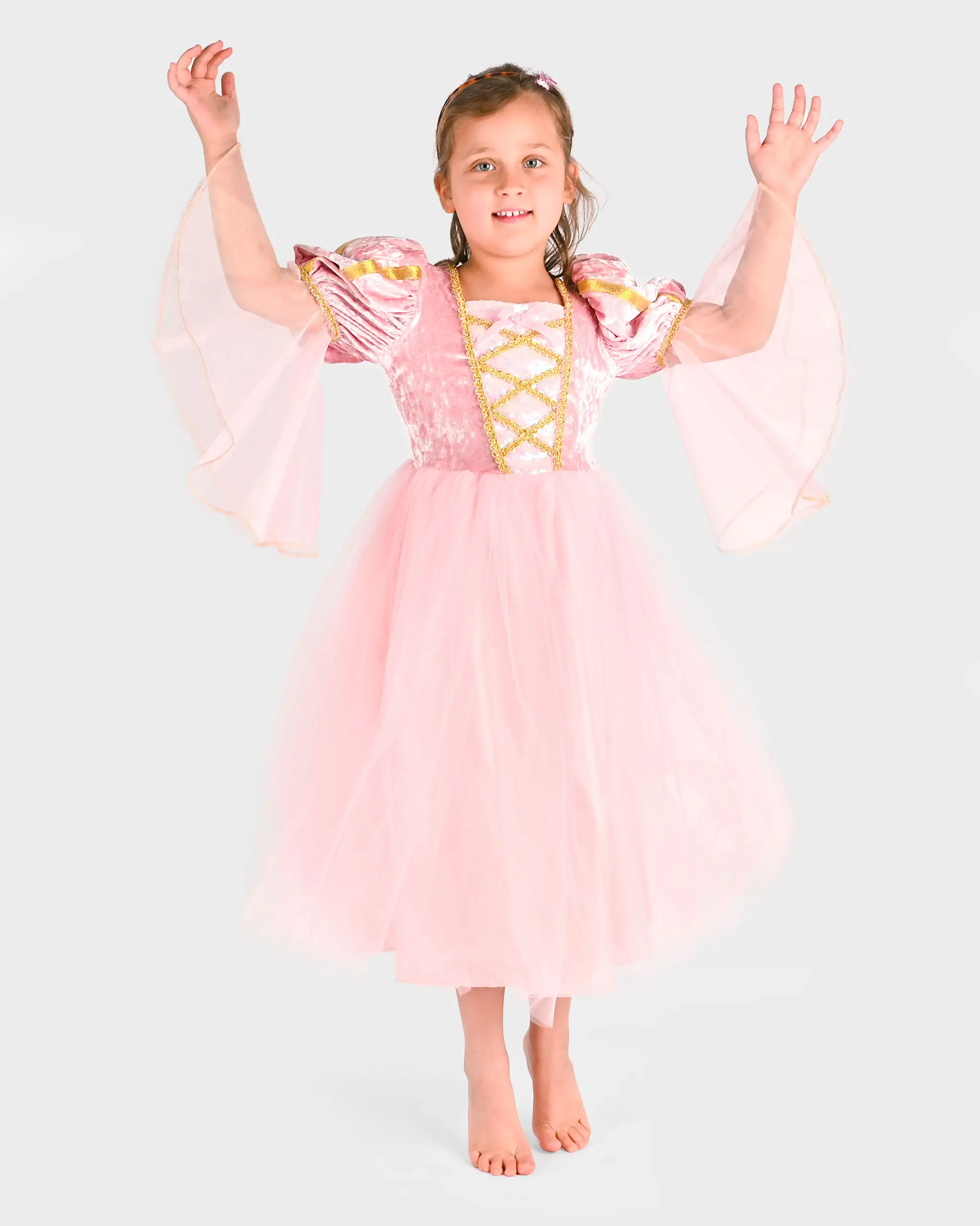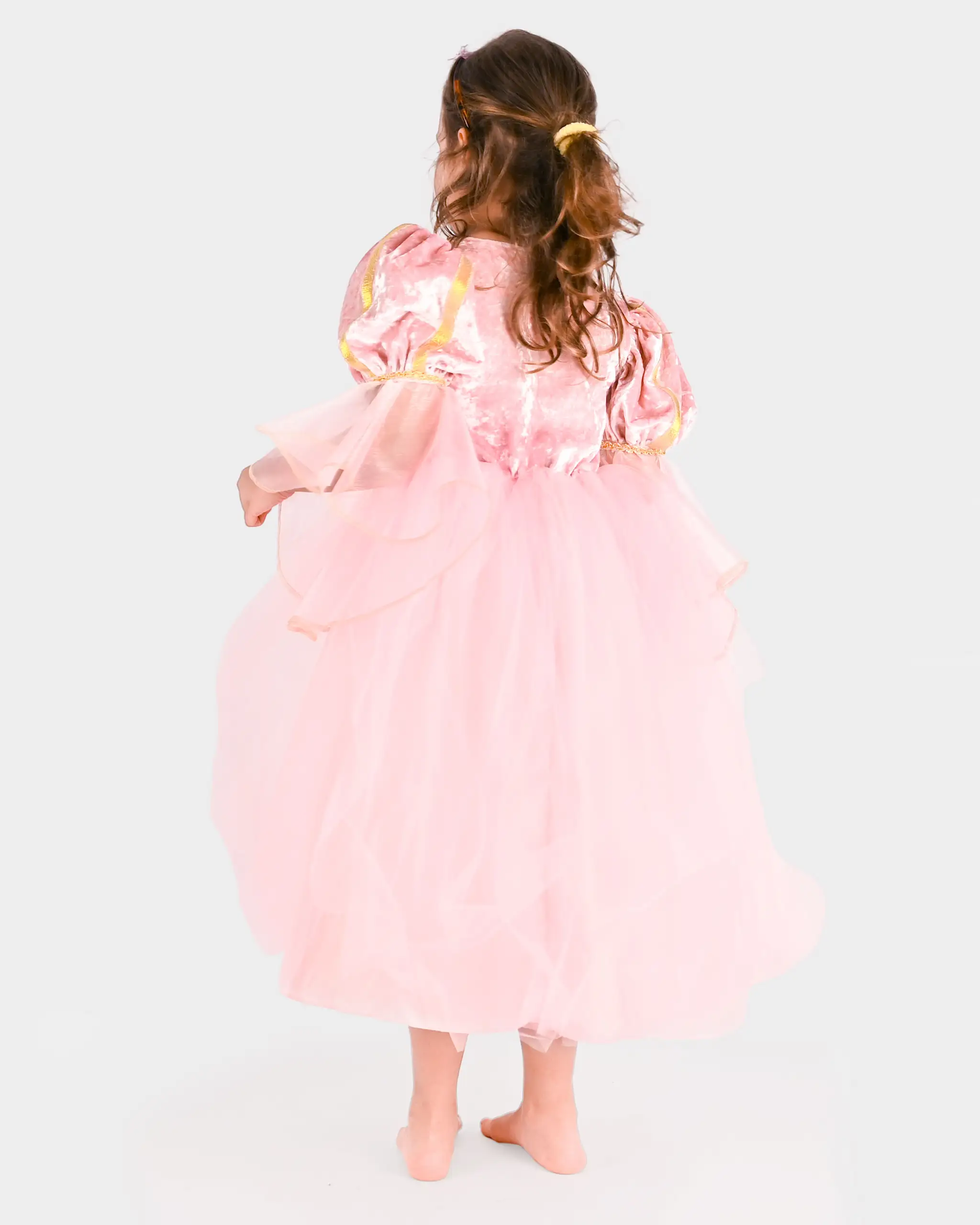 Το φόρεμα διαθέτει βελούδινο μπούστο σε ροζ απόχρωση με χρυσές διακοσμητικές λεπτομέρειες στο μπροστινό μέρος, ενώ τα φουσκωτά μανίκια με διαφάνεια προσθέτουν αρχοντική χάρη. Η πλούσια τούλινη φούστα χαρίζει κίνηση και αίσθηση παραμυθιού σε κάθε βήμα.