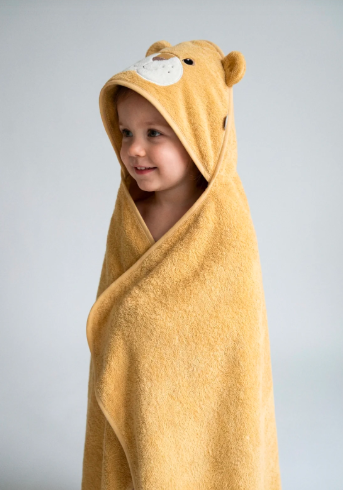 Απαλή παιδική πετσέτα μπάνιου με κουκούλα σε σχέδιο χαριτωμένου λιονταριού Leo που κρατά το παιδί ζεστό μετά το μπάνιο.