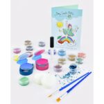 2 πινέλα, glitter σε 4 χρώματα, τζελ για τα νύχια, κατάλληλο για παιδά, 2 σφουγγαράκια και οδηγίες χρήσεως.
