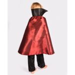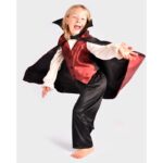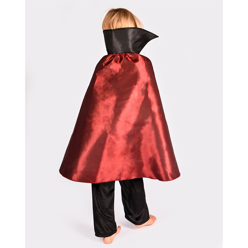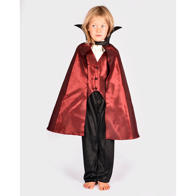 Κοστούμι Δράκουλα. Αποτελείται από 4 κομμάτια. Μαύρο βελούδινο παντελόνι, κόκκινη κάπα με ψηλό γιακά και κούμπωμα στο μπροστινό μέρος, κόκκινο γιλέκο και λευκό γιακά από μεσα.
