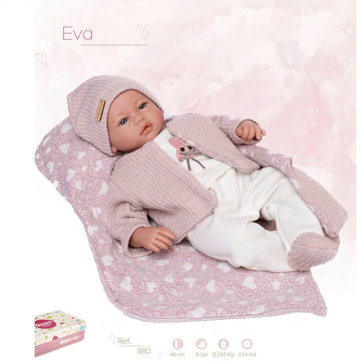 880, Guca, Κούκλα Μωρό, Eva, με ροζ ζακετάκι και κουβερτάκι ροζ με καρδούλες, 46εκ