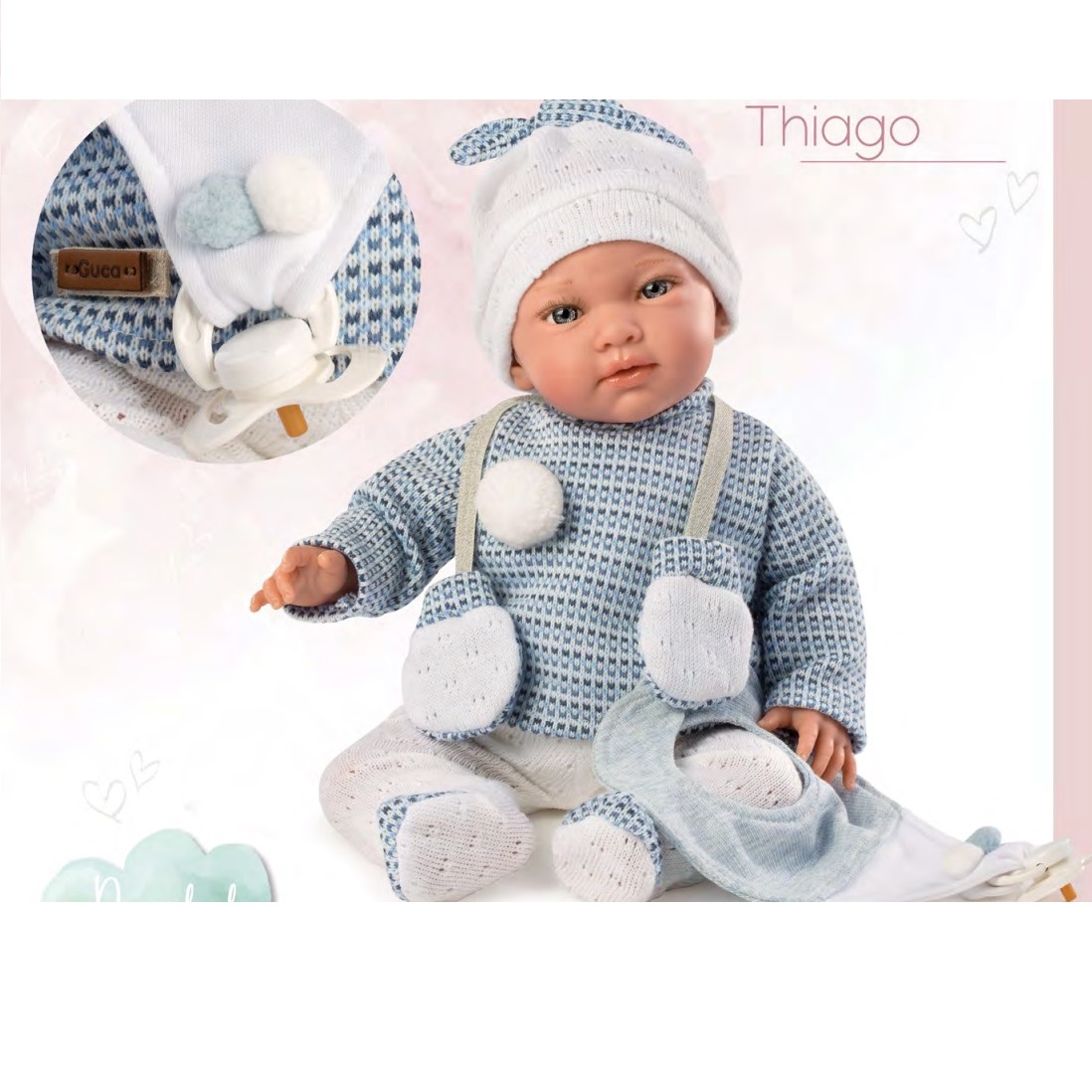 Η κούκλα Μωρό Thiago σίγουρα ξεχωρίζει με τα πιο in ρούχα που φοράει! O Thiago έχει ύψος 40 εκατοστά, δεν έχει μαλλάκια και όταν τoν αγκαλιάζεις σφιχτά, γελάει! Έρχεται με ένα υπέροχο ριγέ πλεκτό σε γαλάζιες αποχρώσεις, γαντάκια και σκουφάκι που ολοκληρώνει την εμφάνιση του. Μαζί έρχεται το μαλακό κουβερτάκι του, που τον κρατά ζεστό όσες βόλτες και αν πάει.