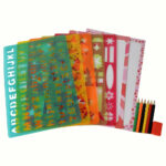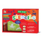 Το μαγικό κουτί περιλαμβάνει 5 πλαστικά φύλλα με στένσιλς, 6 μολύβια χρωματιστά, 20 λευκά φύλλα για να αποτυπώσεις τα σχέδιά σου και 1 ξύστρα.