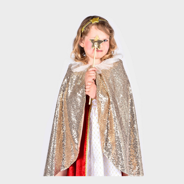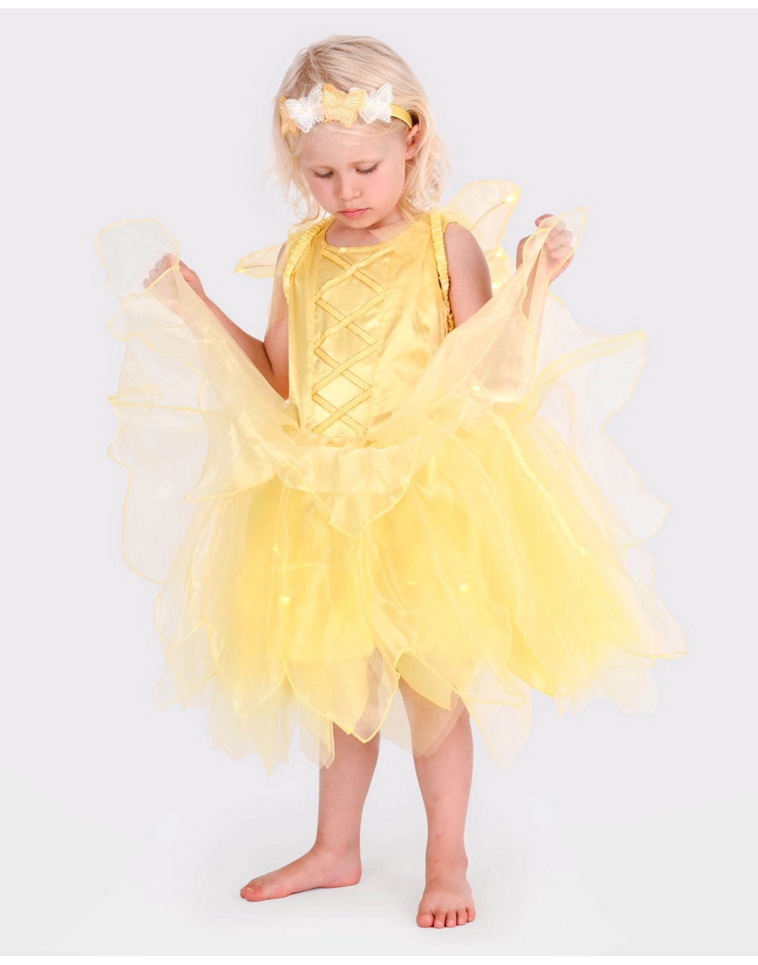Παιδική στολή νεράιδας σε κίτρινο χρώμα με φόρεμα από τούλι και ενσωματωμένα φωτάκια, που προσδίδουν εντυπωσιακή εμφάνιση. Διαθέτει διάφανα φτερά και άνετη εφαρμογή, κατάλληλη για πολύωρη χρήση.