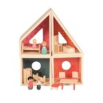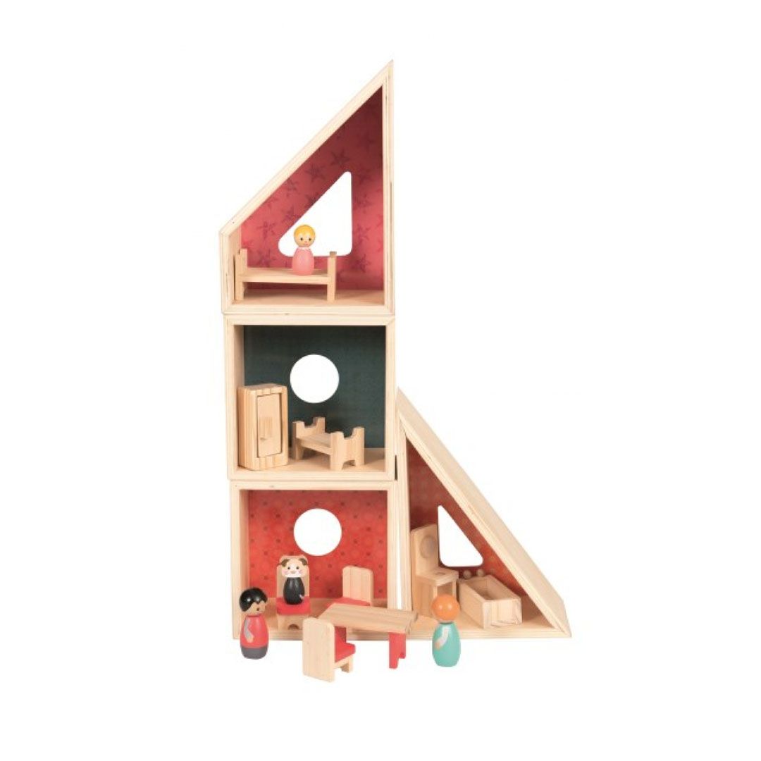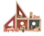 Ξύλινο κουκλόσπιτο-παιχνίδι σύνθεσης. Μπορεί να πάρει πολλές μορφές, ανάλογα με τον τρόπο που θα τοποθετηθεί. Περιλαμβάνει πλήρες σετ επίπλων για 4 δωμάτια, καθώς και φιγούρες για οικογένεια.