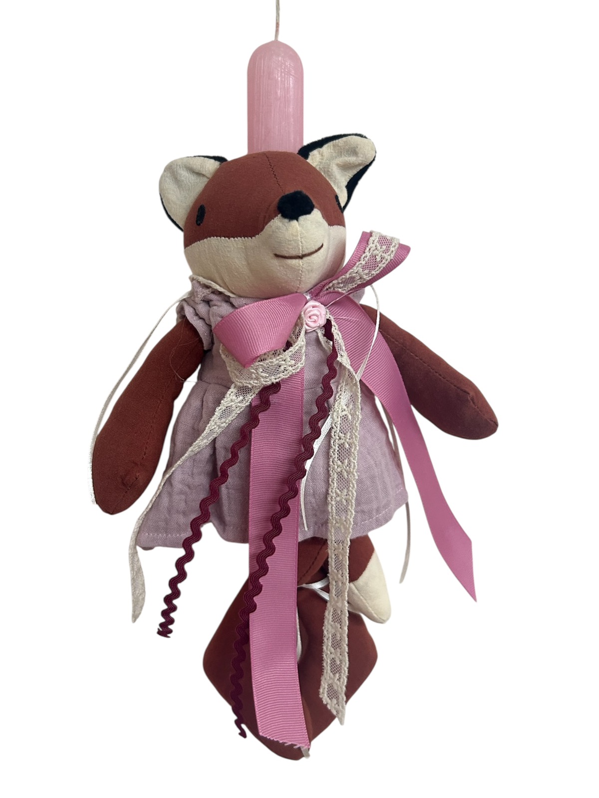 Μια κομψή και ιδιαίτερα χαριτωμένη πασχαλινή λαμπάδα που ξεχωρίζει με τη λούτρινη αλεπού σε απαλούς ροζ και μπορντό τόνους.